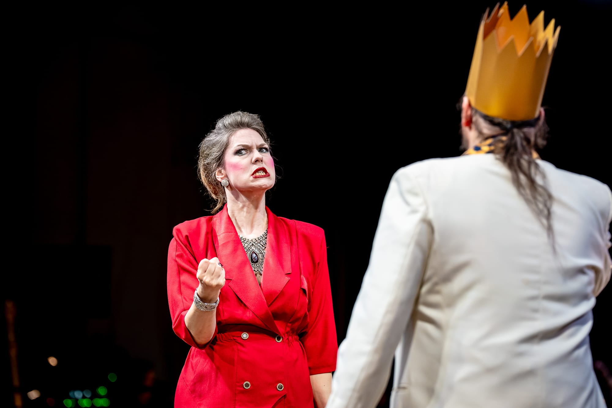 Regents Opera’s show begins with a show-before-a-show: Herod is missing, they are out looking for him, and, enter the auditorium early, and you get to sign Herod’s birthday card as well as watch a strip that far exceeds Salome’s seven-veiled dance in intimacy (the cabaret/burlesque performer Claire de Lunacy) . And we are in the infamous East End of London, so of course references to East End lads works, just as Alberich’s air-boxing worked as a tribute to York Hall’s history in the Regent’s Opera Ring. Costumes are brilliantly conceived by Hannah Schmidt, who was also responsible for sets.