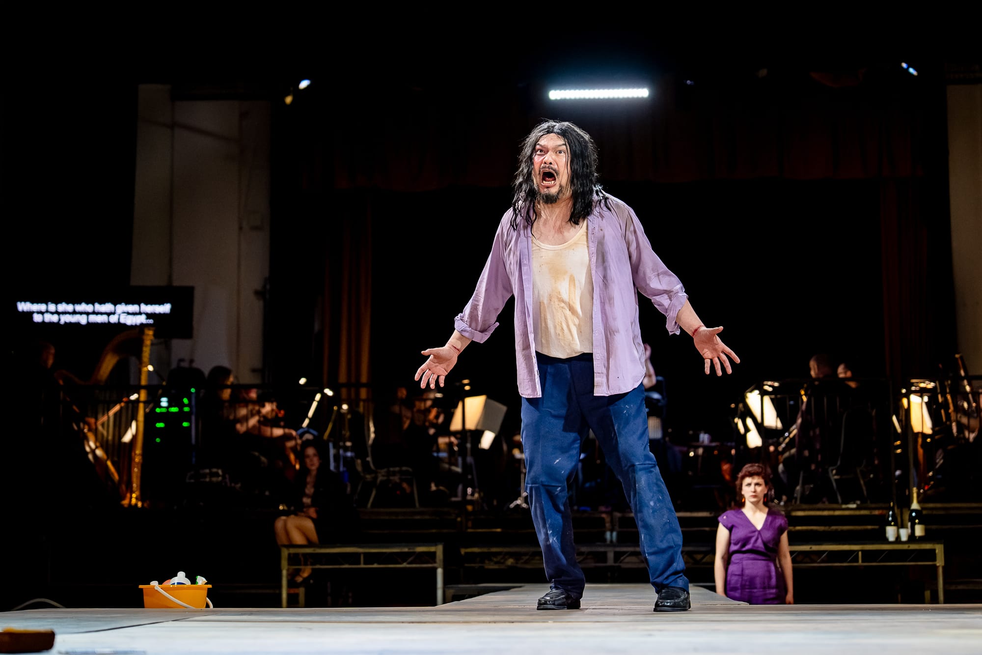 This is a dark opera: but is it “dangerous,” as the glossy programme booklet claims? Surely we’ve all seen plenty of decapitated Johns? Well, the more gory parts did cause a couple of exits on opening night, but small matter. Mark Ravenhill’s staging is in the round, with the orchestra on stage and video feeds so the cast can see conductor Ben Woodward at all times. They are needed: the full space is used, with Jokanaan both below the raised part of the stage, and in the upper back part of the hall, at various points. Off-stage singing of “Happy birthday to you” before the opera opens uses space effectively, too. But is the lighting of Azusa Ono that really makes the production: an expert with both dark and light, she captures the atmosphere of foreboding in Strauss’ score to perfection.