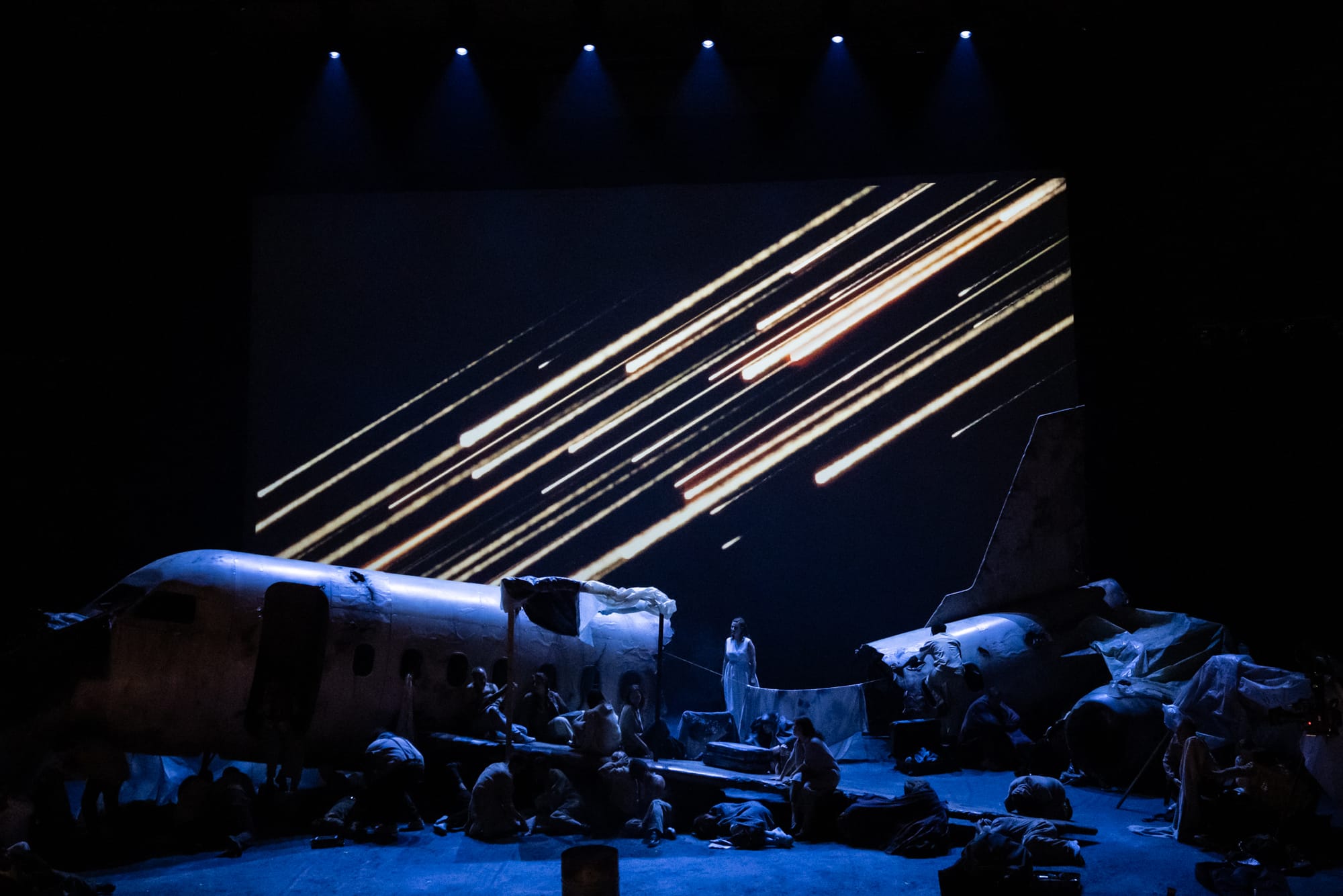 So instead of an hieratic Brahms Deutsches Requiem (or, as here, Un requiem allemand), Equilbey persuaded us this was as close as Brahms ever got to opera. The audience enters to the spectacle of a splintered aeroplane; we are privy to the (surprisingly many, given the state of the plane) survivors, now displaced wanderers: as are so many, after the disruptive events of war, Bobée sms to be saying. The linear revelations of the orchestra on period istuments were balanced by a sense of dramatic drive, nowhere more apparent than in the second movement, “Dann alles Fleisch ist wie das Gras”. The movement is predicated on growing tension; it was to Equilbey's credit that the climx was as powerful as any. The suspensions in the wind against the choral resolution took on an acidic bite that cut straight to the heart. The opening “Selig sind” was of wonder, but also emaciation. As Bobée points out, Brahms' German Requiem speaks both of life, and death, and of a “universal spiituality”. The crash survivors are a metaphor for “human failings and a world hurtling towards its downfall” (again, Bobée's words). The human collective (the chorus) emerges form the debris. The kernel of the final hope is perhaps in the very act of survival itself, therefore, just as the seeds for redemption and peace exist in Brahms' opening. Above all that is the hope for an ecological re-awakening for our planet (in this sense, it links to Insula's Pastoral for the Planet of some years ago).