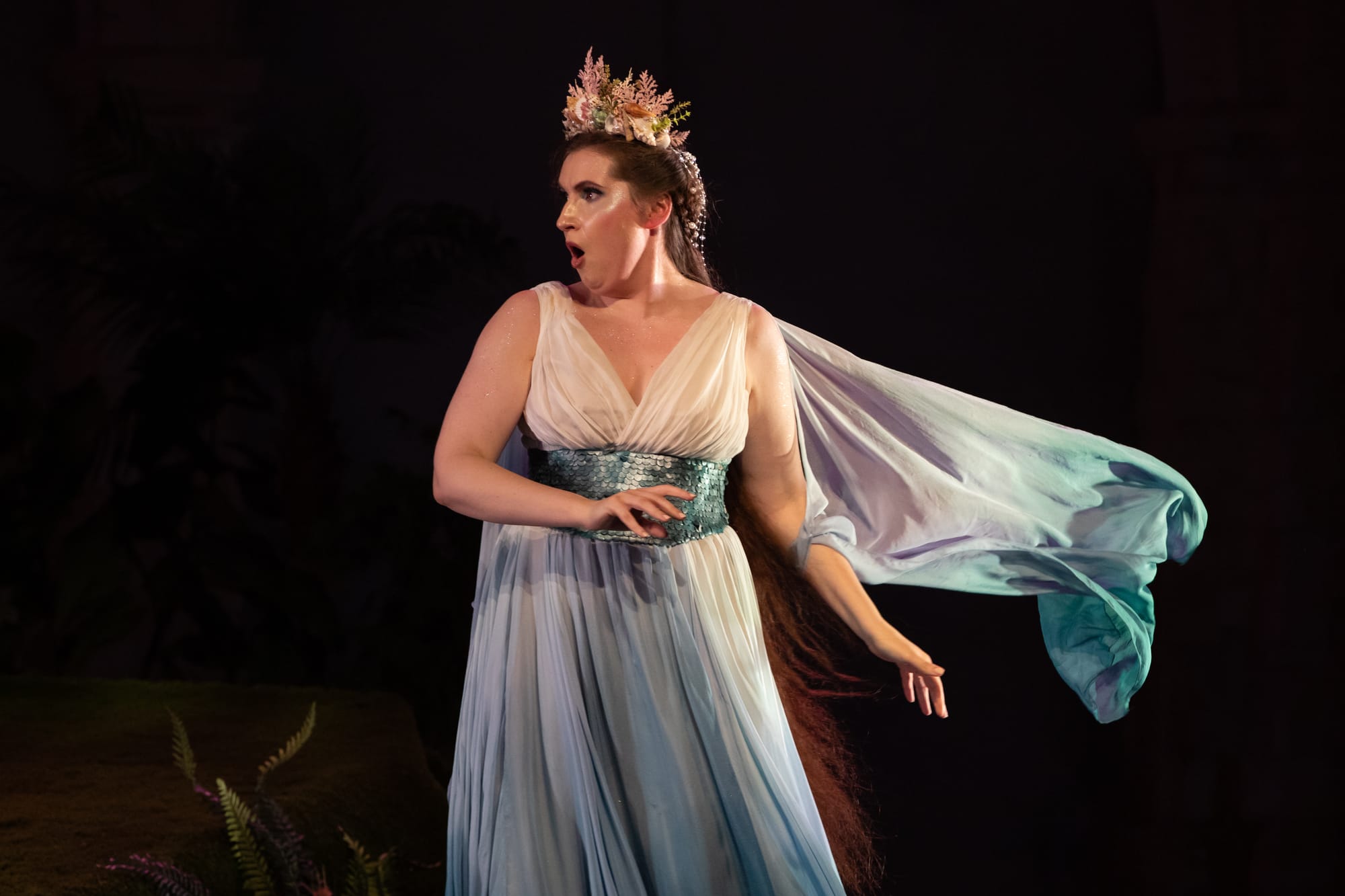 Director Louise Bakker was assistant director for the magnificent Vixen at OHP recently; on her own ticket here in Handel’s Acis, she provided colour and magic. The stage was divided into areas: a ‘temple,’ a grassy knoll, a swing. This was pastoralism in its very essence – it almost feels de rigeur to mention the word ‘bower’ – with the colours transporting into the world of idealised fantasy. Designer Alyson Cummins transports us to a collective unconscious idyll with all the magic of the Regents Park classic open air stagings of Shakespeare’s A Midsummer Night’s Dream. All this is aided and abetted by the lighting under Lighting Designer Johanne Jensen, who in turn herself is aided and abetted by a ’Lighting Programmer,’ James Smellie.